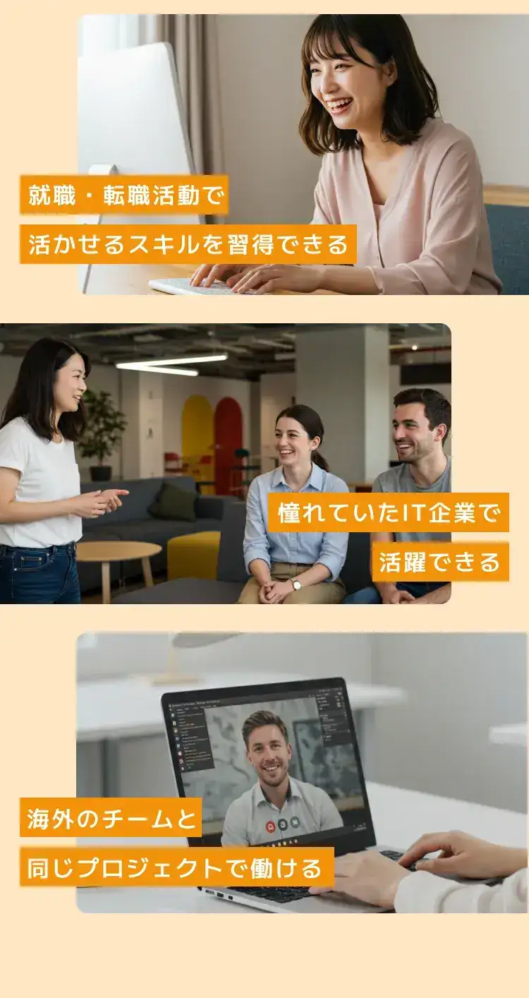 学んだスキルを活かしてグローバルに活躍したい方向けに、専任スタッフが卒業後も伴走してサポートいたします。