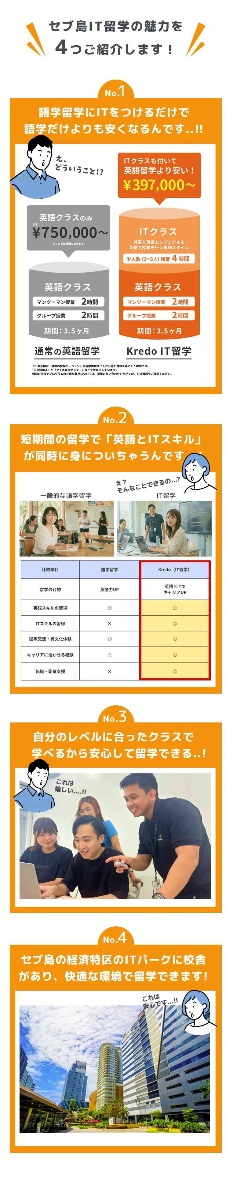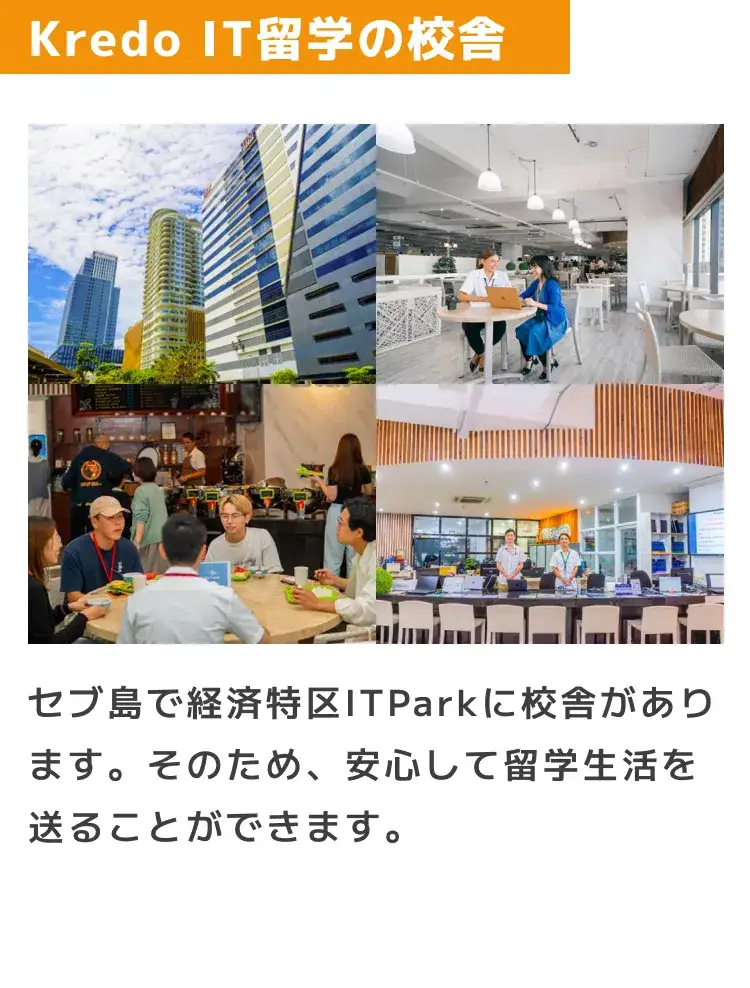 特にKredo/QQEnglishの校舎・宿泊施設が位置している「ITパーク」は、24時間警備員が各ビル、パーク内に常駐しておりセブ島の中でも最も安全なエリアです。 フィリピン留学に来る日本人留学生の数は年間35,000人ほどですが、留学生が目立った犯罪に合うケースはとても少ないです。