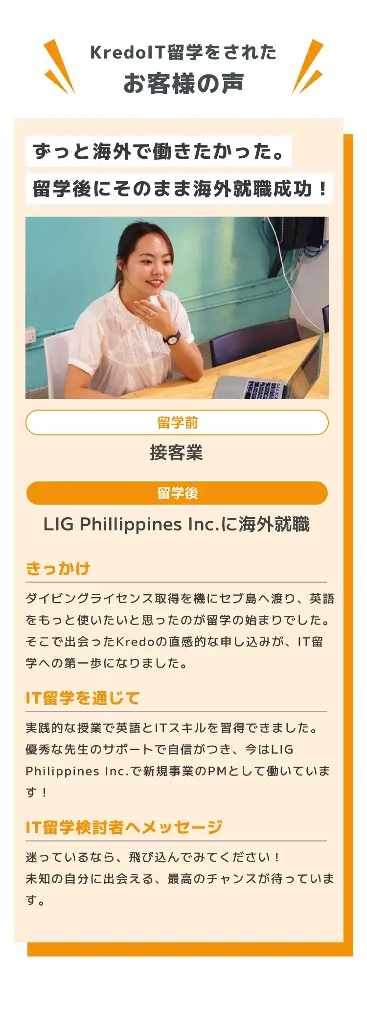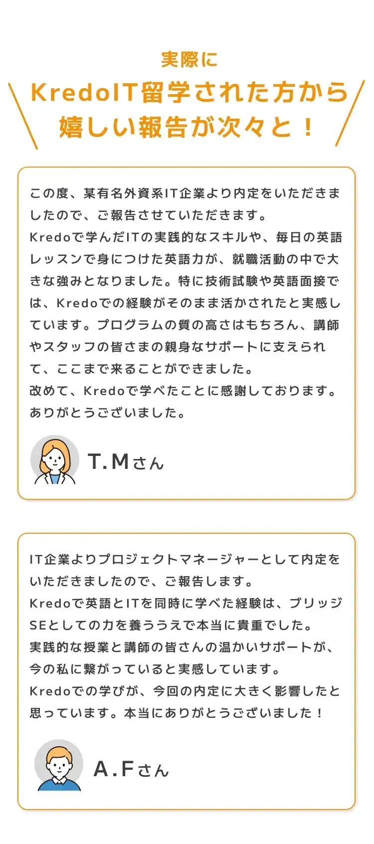 IT企業やWeb制作会社、外資系企業、海外就職、フリーランスなど多様な進路があります。事例を知りたい方はKredoインスタグラムの体験談動画や体験談記事をご覧ください。