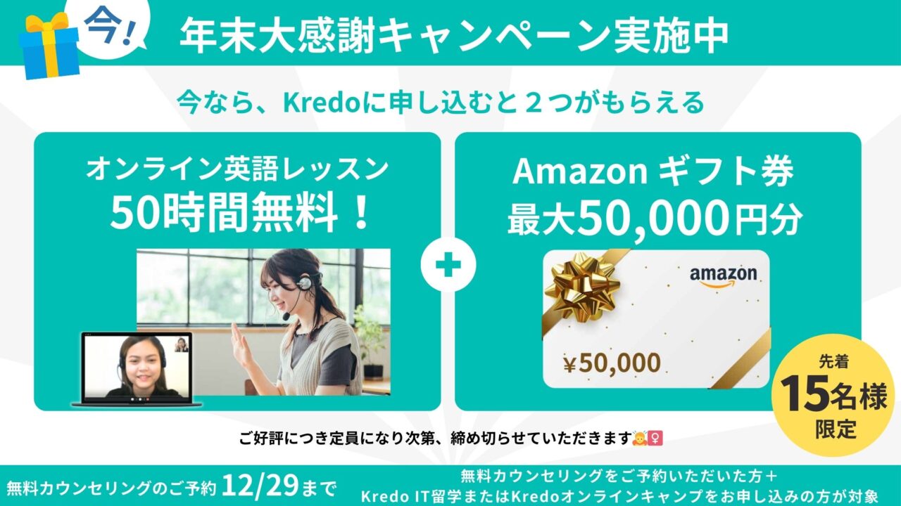 オンラインセミナー(ウェビナー)終了後24時間以内に無料カウンセリングをお申し込みの方は「オンライン英語レッスン50時間無料」+「Amazonギフト券最大50,000円分」をプレゼント!!